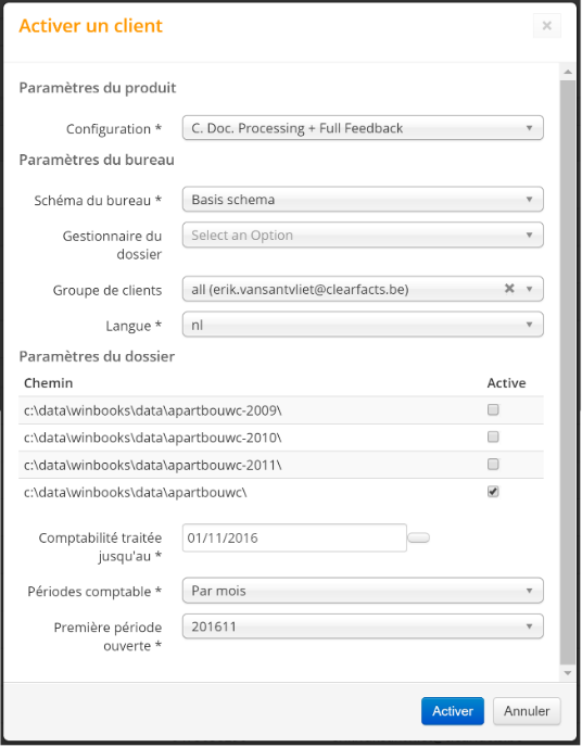 Lorsque le dossier du client a été ajouté dans la liste des clients, vous pouvez cliquer sur le bouton ‘Activer’.