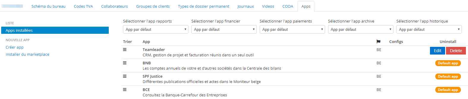 Au niveau du bureau comptable, vous pouvez définir la liste des différentes Apps que vous pouvez ensuite activer ou pas dossier par dossier.