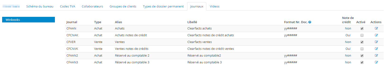 ClearFacts transférera dans votre solution comptable les différentes factures d’achats et de ventes dans des journaux. Au niveau du bureau comptables, vous pouvez définir les différents journaux qui seront proposés lors de l’activation d’un nouveau dossier.