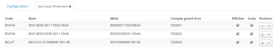 Si vous voulez activer le menu financier pour la visualisation des extraits bancaires, vous pouvez définir les journaux de type banque qui seront affichés. Uniquement les journaux créés dans la comptabilité pour lesquels un numéro de compte IBAN est définit seront repris dans la liste.