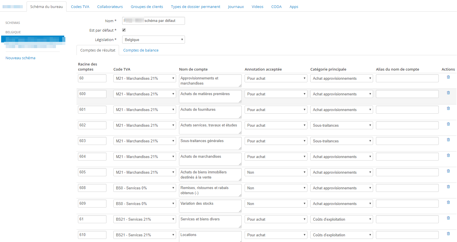 Le schéma du bureau comptable permet de définir quels seront les comptes qui seront liés aux différentes catégories disponibles dans ClearFacts. Pour éviter de devoir lier compte par compte à une catégorie, nous nous basons sur la racine des comptes. Par exemple tous les comptes commençants par 6101 seront liés à la catégorie des Loyers.