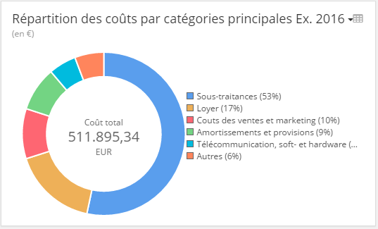 ClearFacts présente à vos clients différents graphiques sur le tableau de bord. A ce niveau, un graphique est affiché pour la répartition des coûts suivant différentes catégories. Le client ne voit donc pas directement les comptes mais ceux-ci sont regroupés par catégories comme dans le graphique suivant.